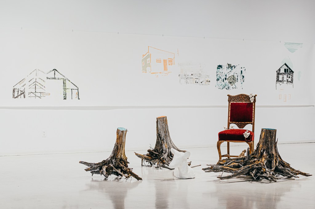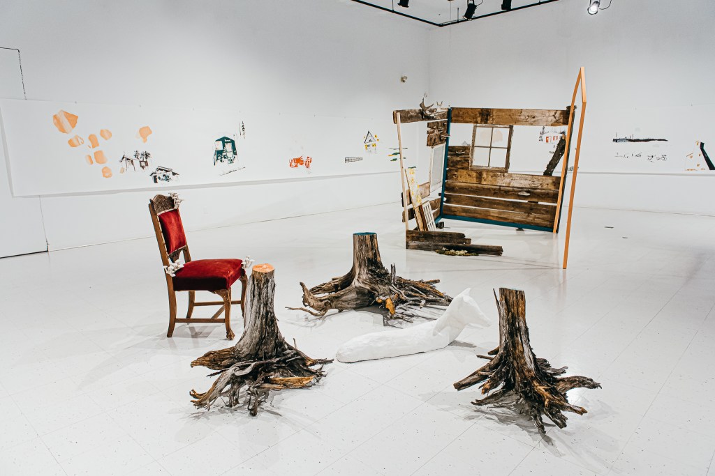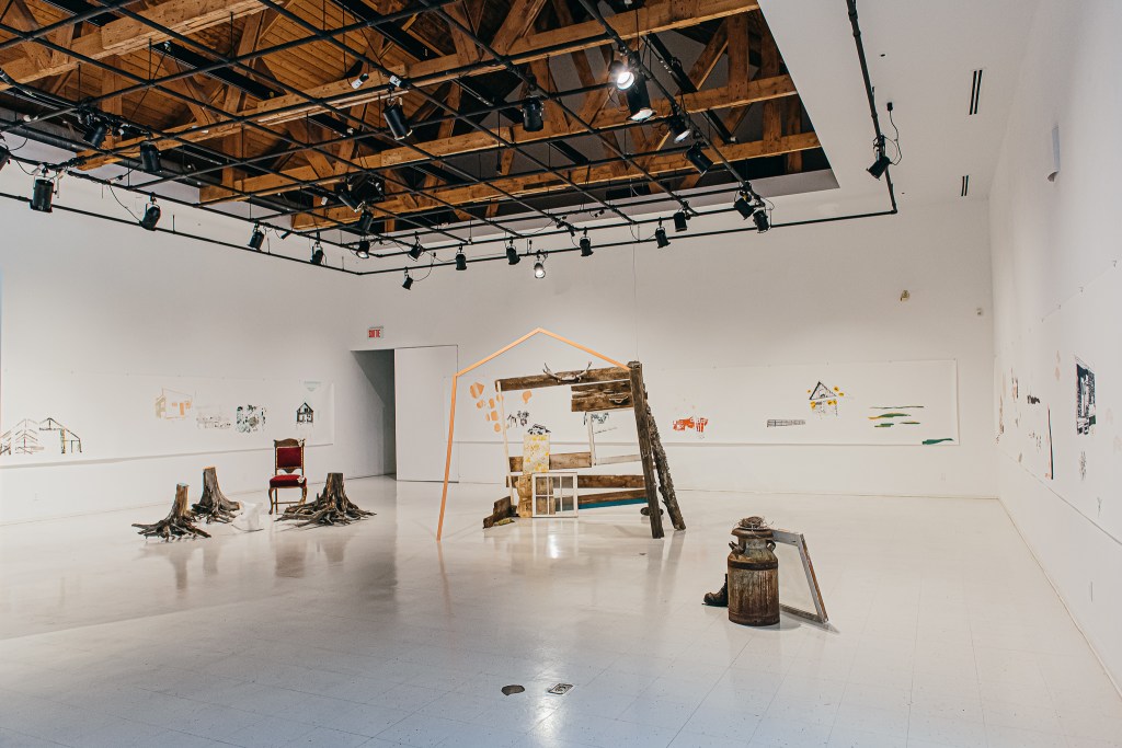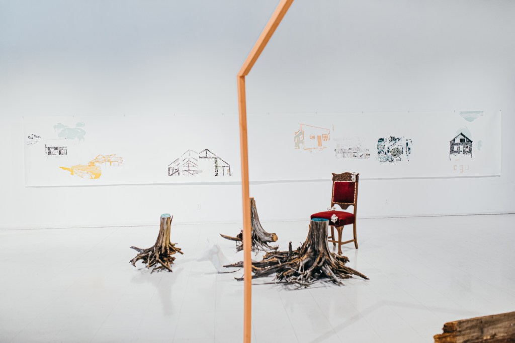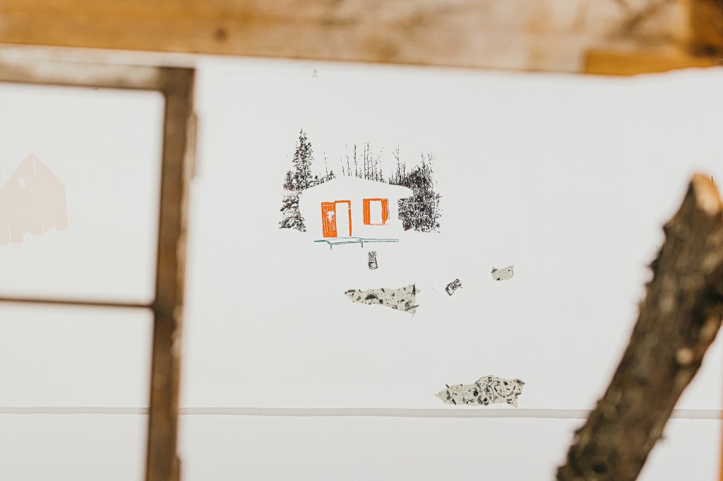 De son côté, Émilie a procédé à une cueillette de matériaux issus de bâtiments abandonnés ou déconstruits. Les granges désuètes ou simplement tombées en plein champ sont nombreuses au Témiscamingue et elles abondent de matériaux abimés, mais remplis d’histoire. Plusieurs maisons abandonnées tiennent encore debout, comme des monuments, principalement dans l’est de la région. L’oeuvre installative d’Émilie est construite avec les matériaux récupérés, où les bâtiments sont représentés par quelques lignes et quelques bouts de tapisserie.
