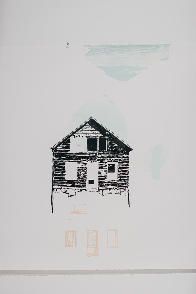 L’oeuvre d’Édith est une interprétation personnelle du patrimoine bâti, où les souvenirs vaporeux se mélangent à des bâtiments décomposés ou présentés en fragments. Il s’agit d’une oeuvre où l’imaginaire de l’artiste rencontre les témoignages intimes des citoyens pour en résulter une composition épurée et minimaliste d’éléments iconographiques. Les images sont imprimées sur trois bandes de papier d’une longueur totale de 30 mètres, une oeuvre unique qui fait écho à l’horizontalité du paysage, parsemé de bâtiments, de vides et de pleins qui créent une vue d’ensemble qui défie les traditions de l’art imprimé.
